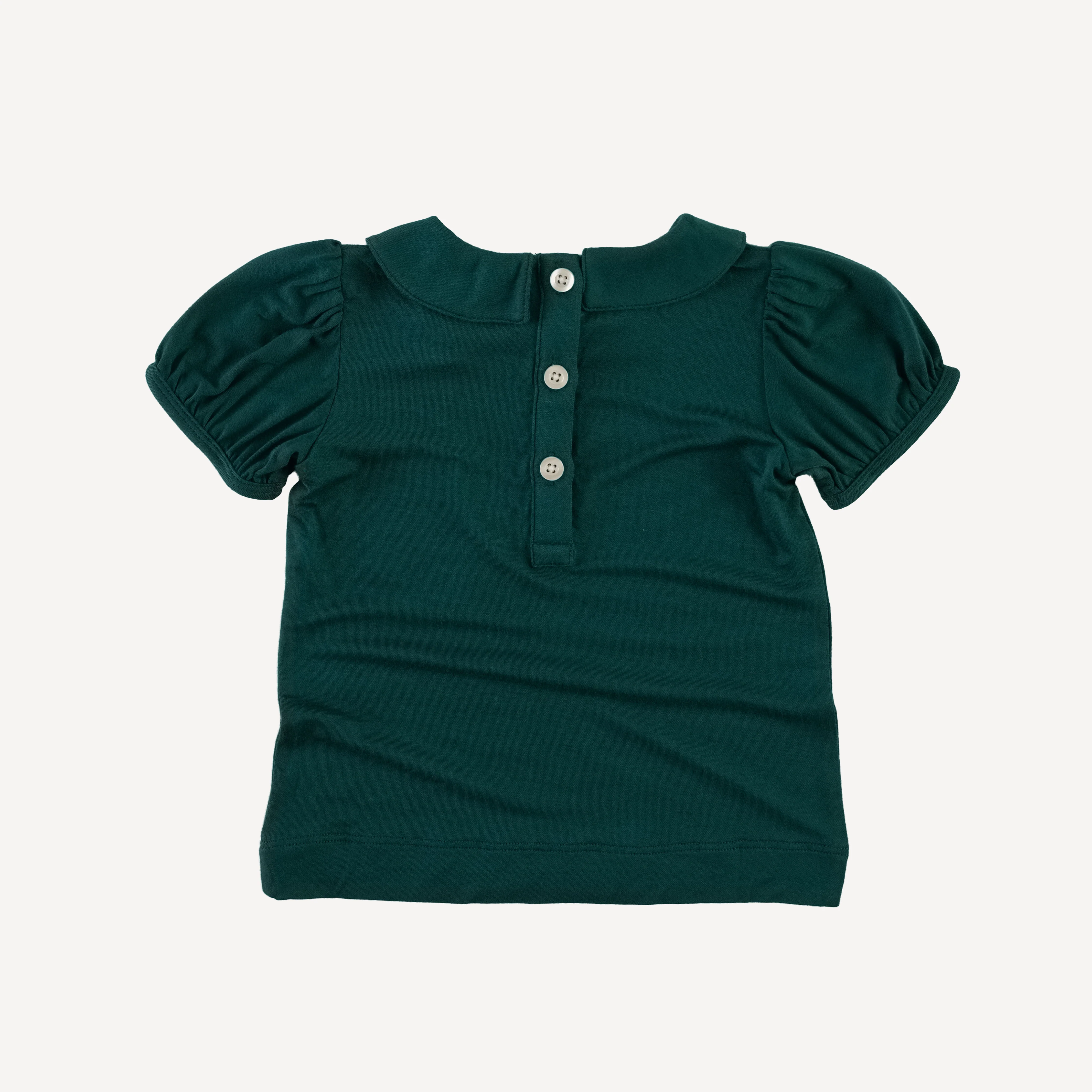 Features peter pan collar, short puff sleeves, and back button placket.